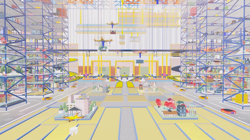 Like an Amazon warehouse, the game world uses a series of shelves on which urban components are stored and collected by various human and robotic pickers.